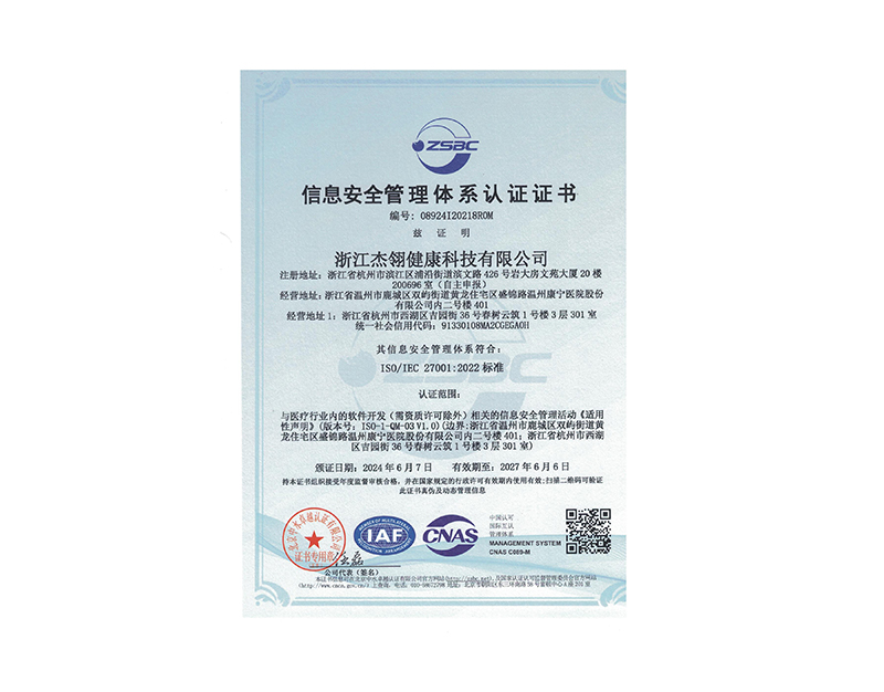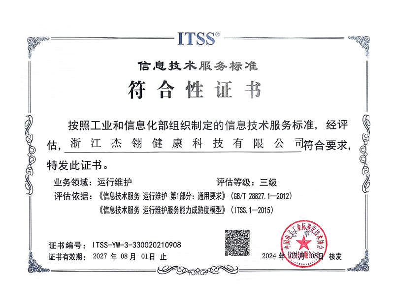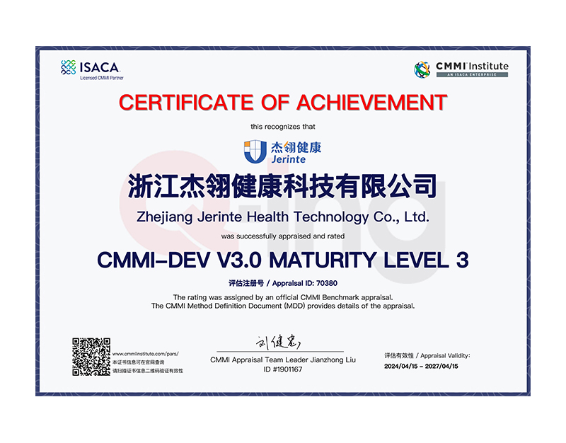 公司成功获得CMMI3 、 ISO9001 、 ISO27001、ITSS等质量认证;并于同年 10 月更名为浙江杰翎健康科技有限公司。
